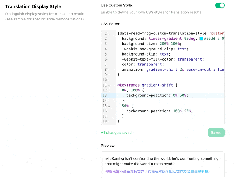 You're in control now. Read Frog's Custom CSS feature lets you design exactly how your translations appear on any website.